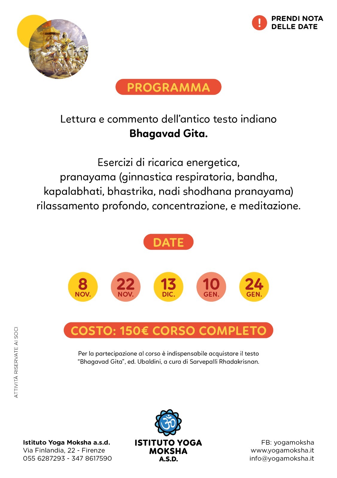 Lettura e commento dell’antico testo indiano Bhagavad Gita, fondamentale per la comprensione e la pratica della metodologia e disciplina Yoga.